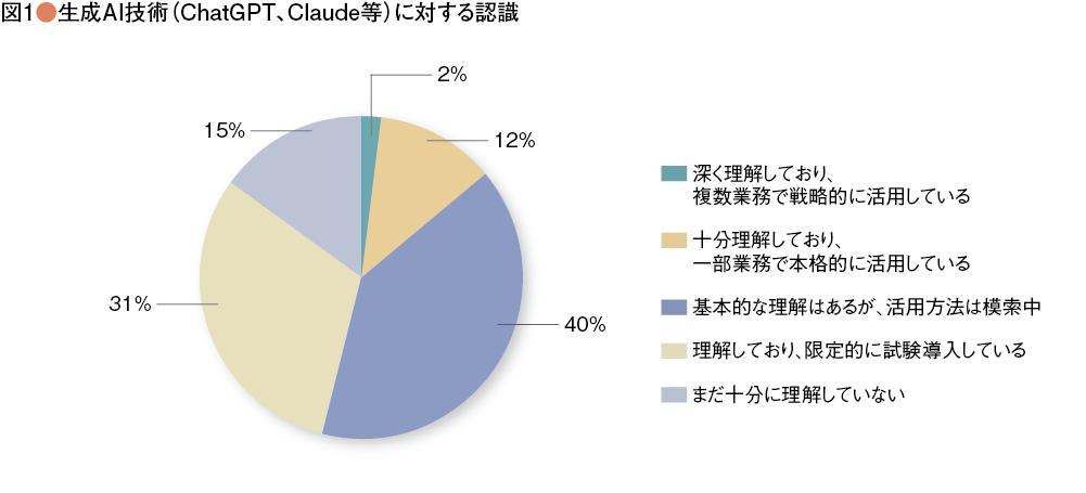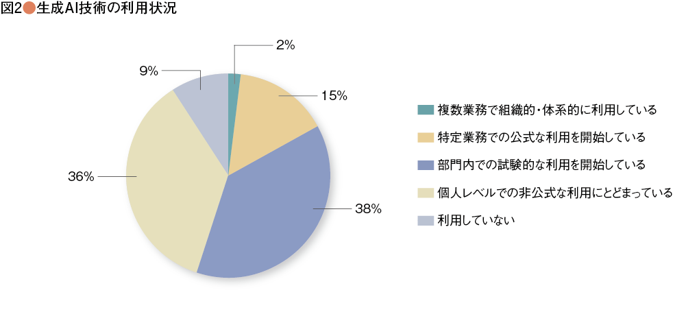今回の調査では、生成AIを本格的に活用している企業は17%にとどまるが、多くの企業が試行・探索フェーズにあることがわかる。個人による散発的な利用と、組織全体での体系的な活用の間には、想像以上に深い溝が存在している(図1、2、3)。